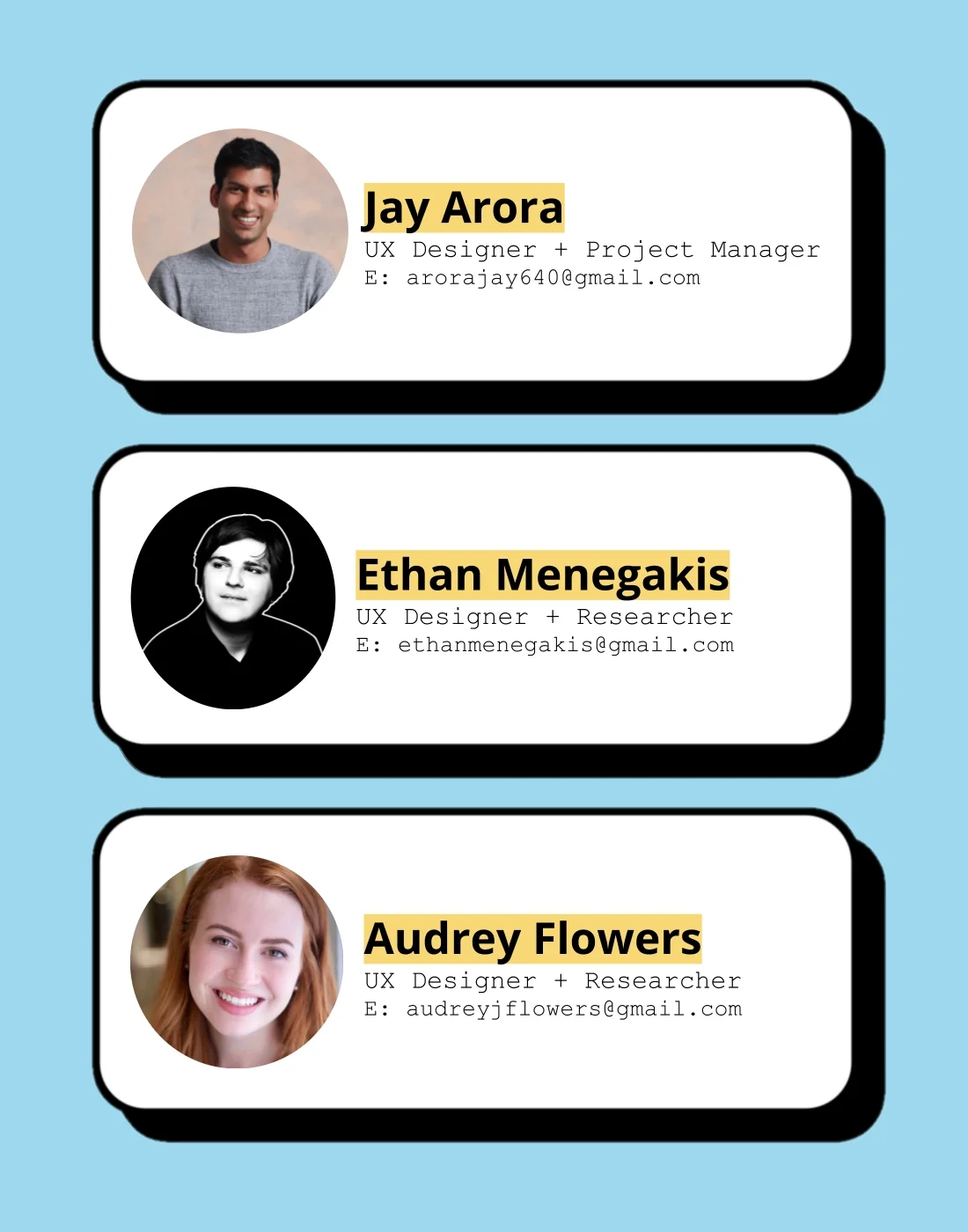 The project had a six-week timeline, covering research, wireframing, prototype development, and the creation of a detailed case study documenting each stage of the process. Led by our project manager Jay, the initiative was a collaborative effort among the three team members, with responsibilities split up to make the most of each person’s individual strengths.