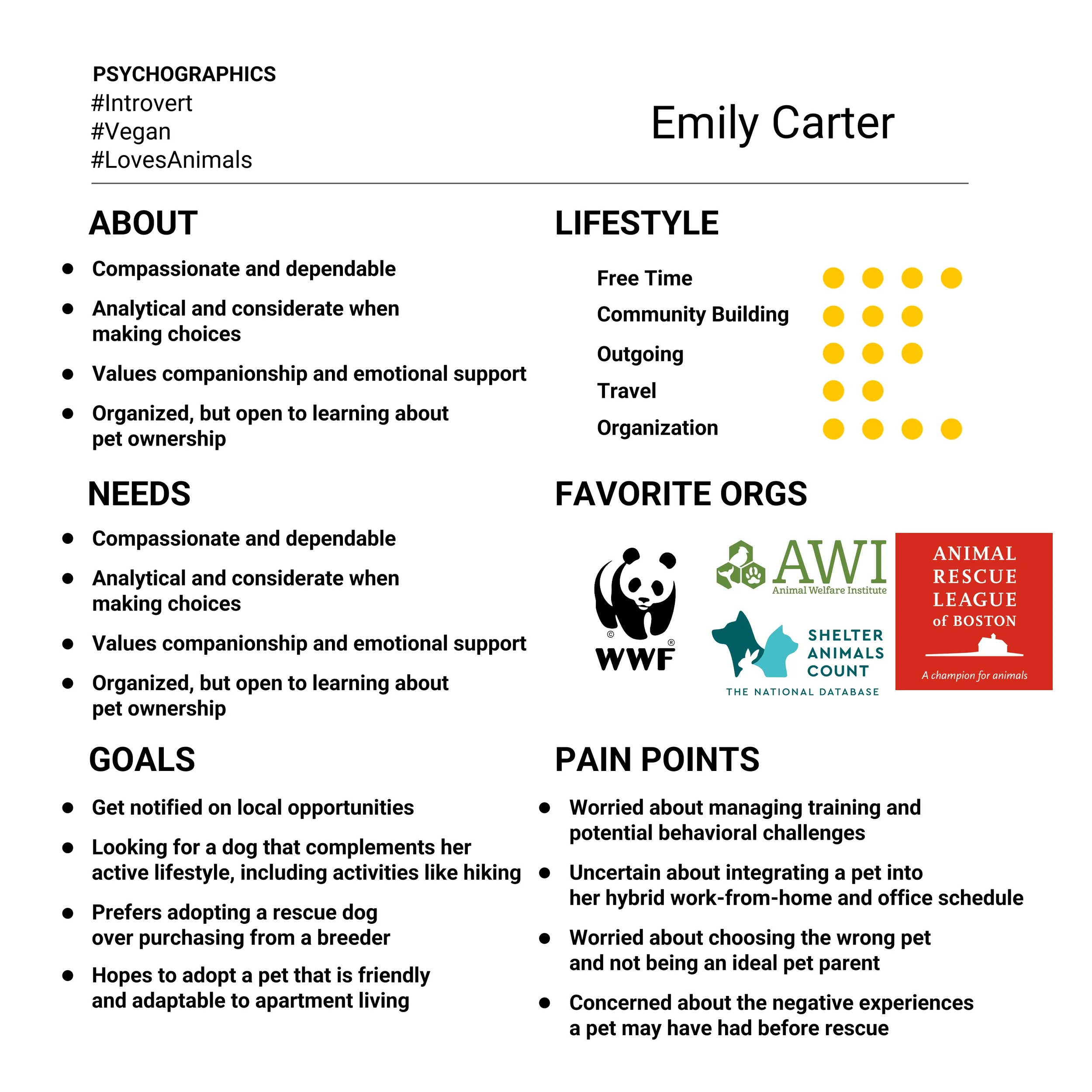 We created a User Persona to represent the hypothetical individual interested in pet adoption. This helped us wrap our heads around the specific needs and preferences someone might have when adopting from a shelter, including practical considerations such as living in a small space or managing a hybrid work schedule.