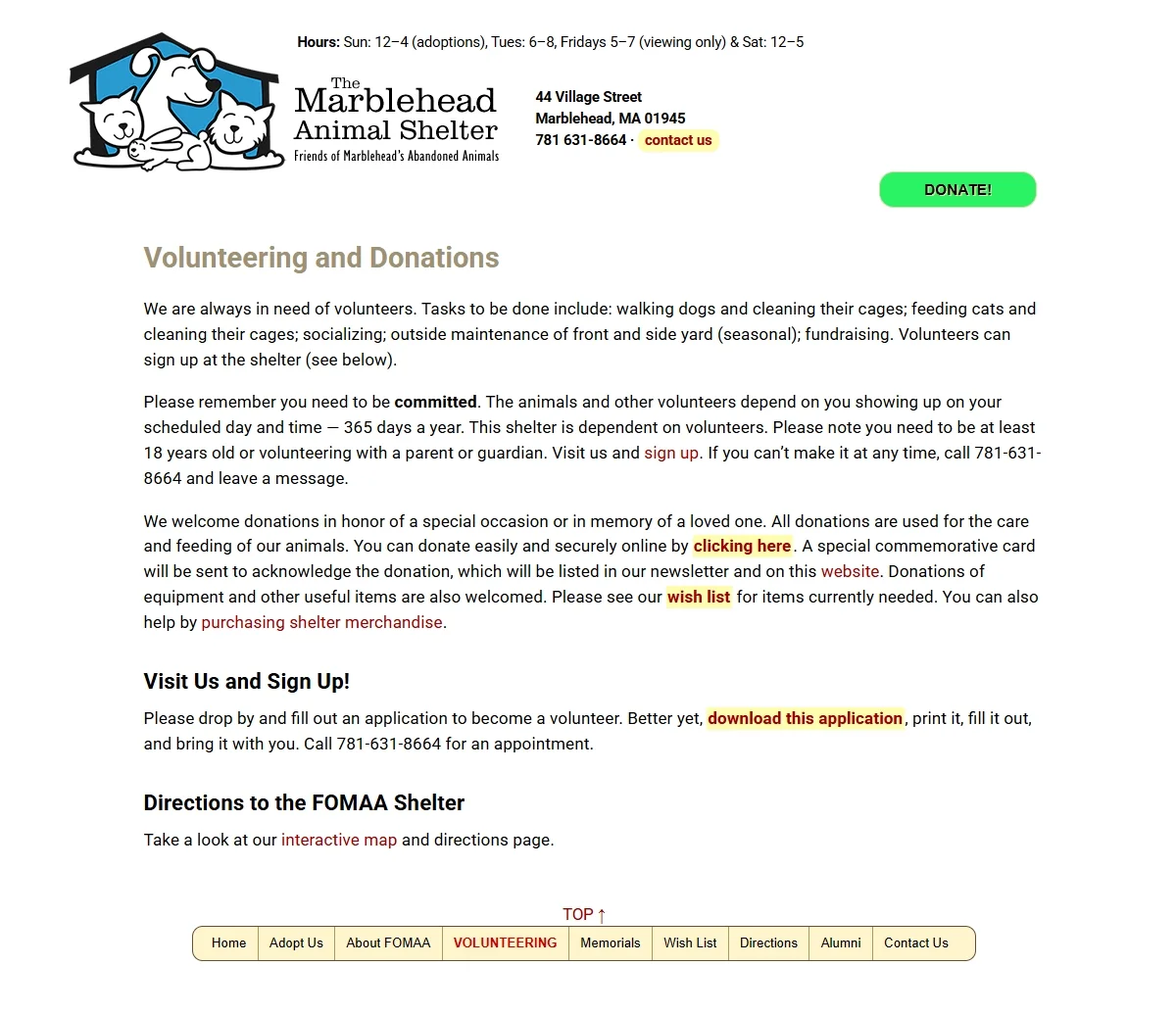 Redesign their outdated website to improve usability, enhance navigation, better showcase adoptable animals, and add volunteer application forms.