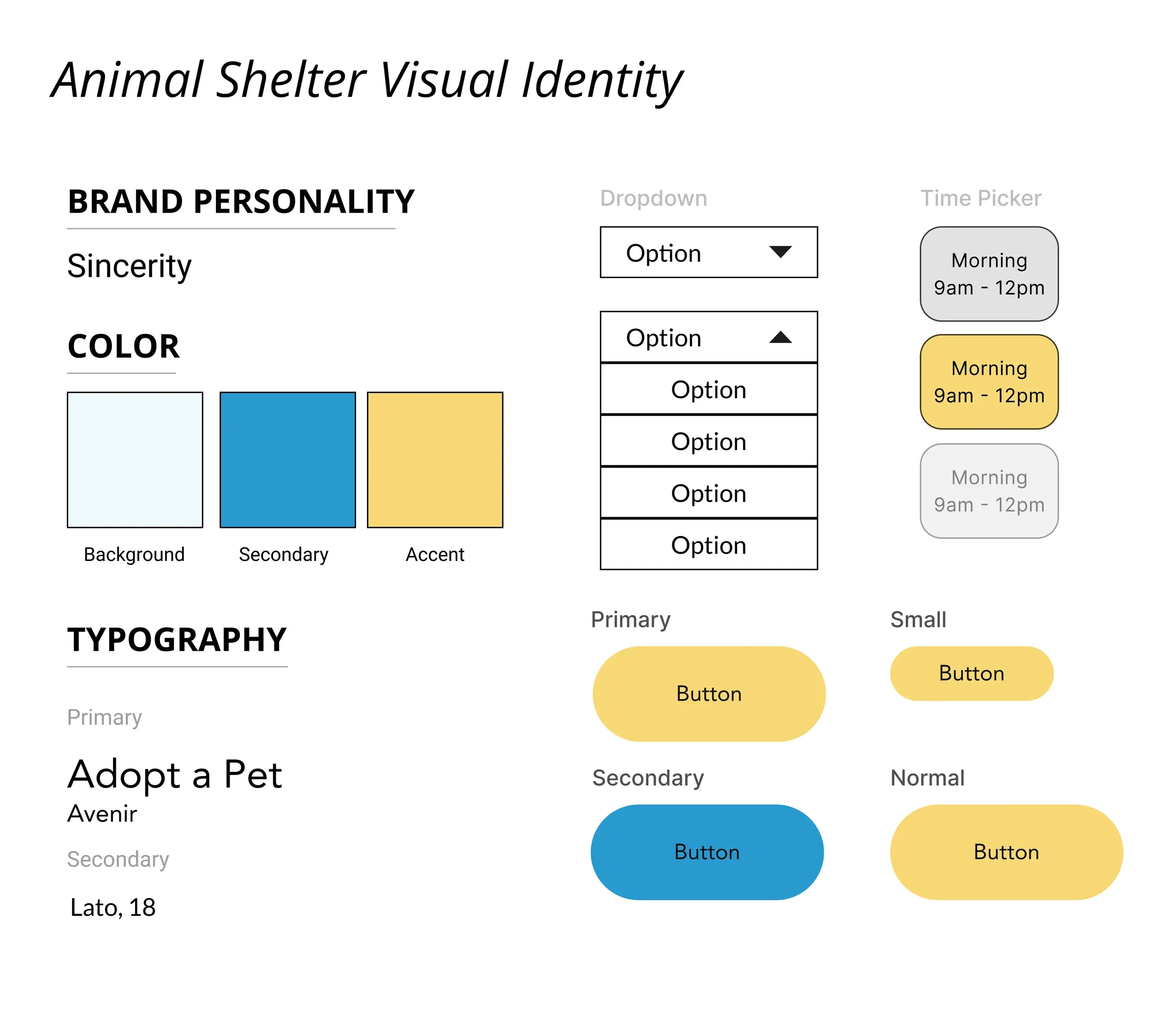 Following our selection of a color scheme inspired by the shelter’s logo, Jay designed a set of standardized components to support the final round of wireframe iterations. These components were essential in ensuring consistent use of headings, typography, colors, and overall branding, helping us maintain a cohesive visual identity across all sections of the site as we began building our High-Fidelity Wireframes.